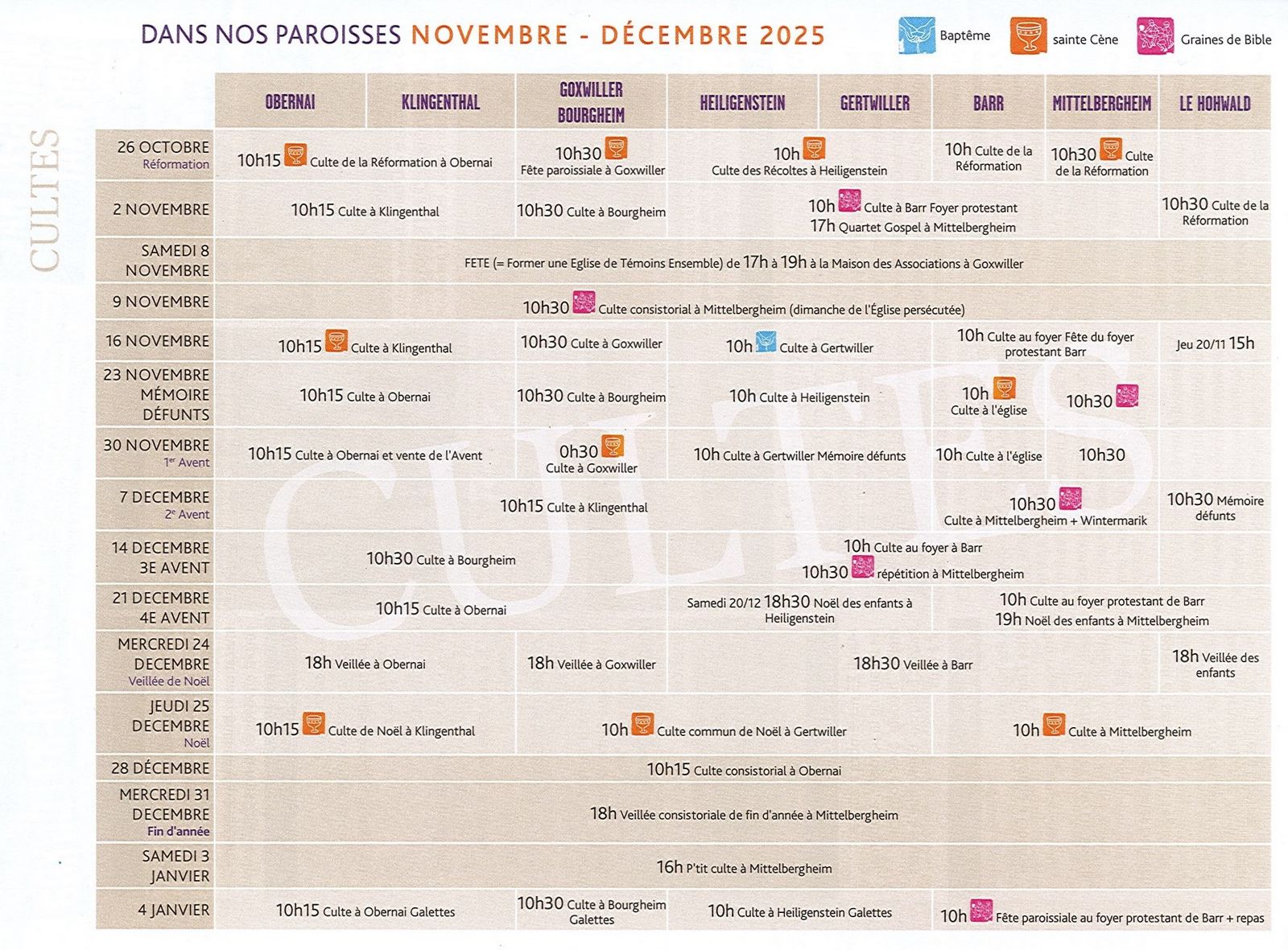 Les cultes particuliers, en mémoire des défunts, veillée et culte de Noël auront lieu à l’église. N’hésitez pas à consulter le tableau ci-dessous.