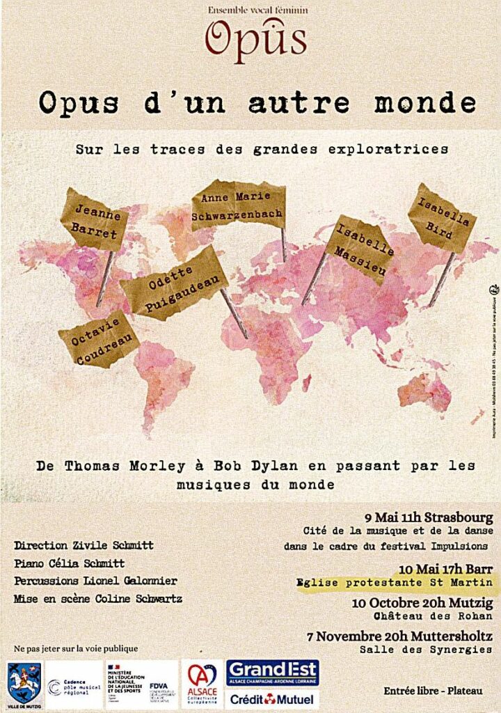 – dimanche 10 mai à 17h : concert de l’ensemble vocal féminin OPUS : « Sur les traces des grandes exploratrices ». Un programme musical de Thomas Morley à Bob Dylan en passant par les musiques du monde. Entrée libre, plateau.